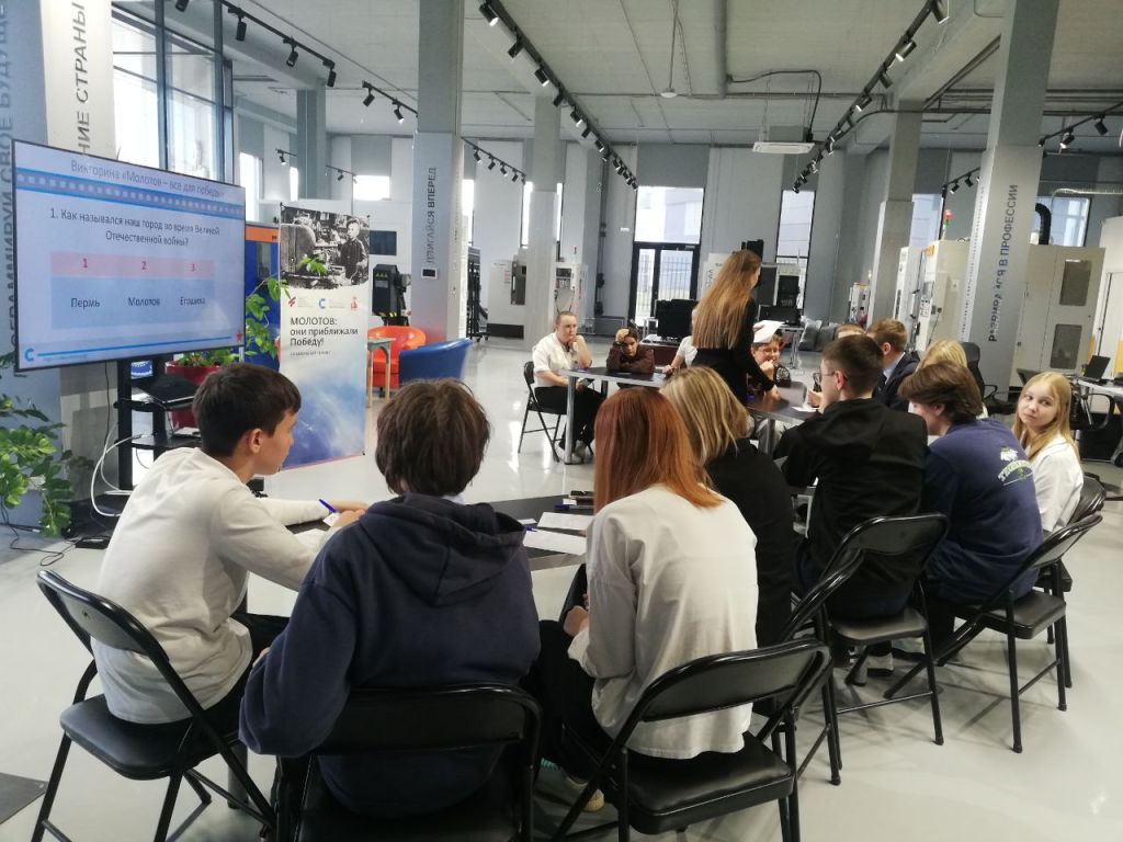 Завершением мероприятий исторического трека стала викторина «Молотов-все для победы». Она включала в себя 17 вопросов о вкладе жителей г.Молотова в приближение Победы. Викторина проводилась в Центре Становление. Для ребят была проведена экскурсия по Центру, где они увидели станки, на которых их одноклассники изготавливали памятные медали Победы на промышленном треке. Для проведения викторины организаторы подготовили бланки для ответов и ручки. Вопросы транслировались с экрана телевизора. Каждый отвечал на вопросы индивидуально. После завершения викторины ребята обменялись заполненными бланками и проверили правильность ответов на вопросы. По итогам в викторине выявилось 12 лидеров, набравших по 15 баллов. Только одному участнику – Шайдурову Елисею из 7А класса Лобановской школы – удалось набрать 16 баллов!